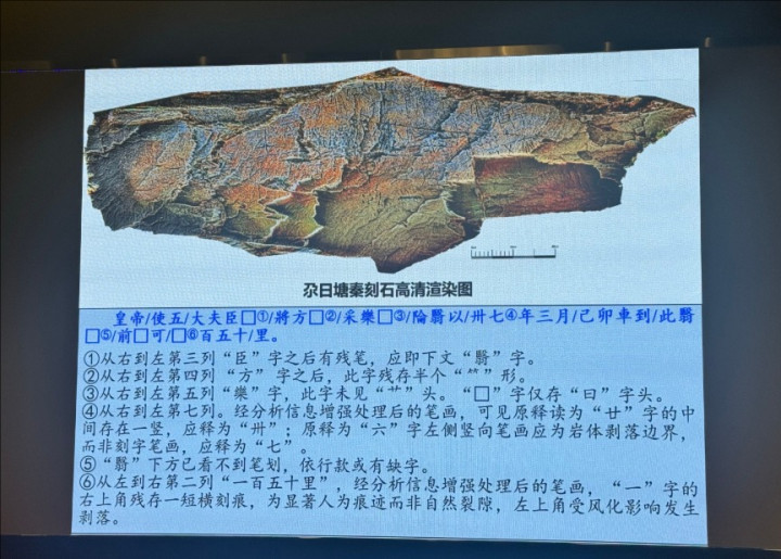 经6月13日、7月15日两次实地勘察,刻石与湖滨坡地共同形成了山体挡风、水域调节微气候的地质条件。经实验室分析,刻石岩性为石英砂岩,耐磨性高、抗风化能力强。经高精度信息增强技术,刻石文字可见明显凿刻痕迹,采用平口工具刻制,符合时代特征。经矿物和金属元素分析,排除利用现代合金工具凿刻的可能。刻痕内部和刻石表面均含有风化次生矿物,经历了长期风化作用,排除了近期新刻可能。中国文化遗产研究院、青海省文物考古研究院基于现场调查和科学检测数据,形成了《青海省玛多县尕日塘秦刻石调查报告》。