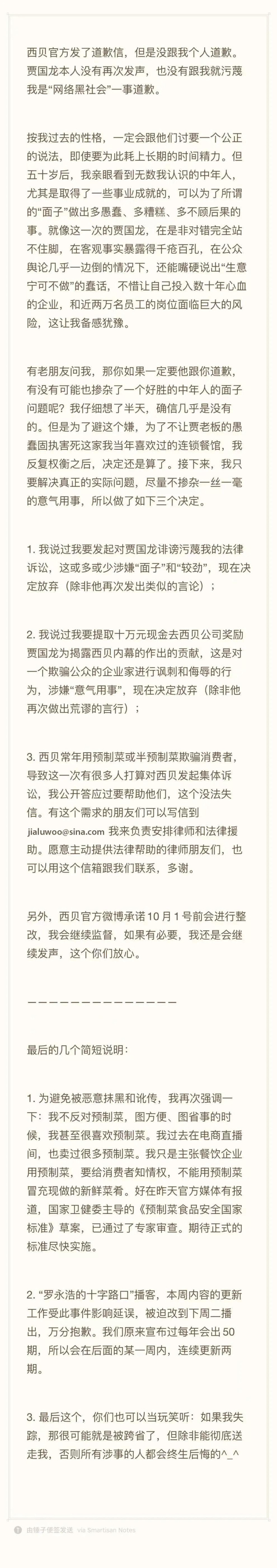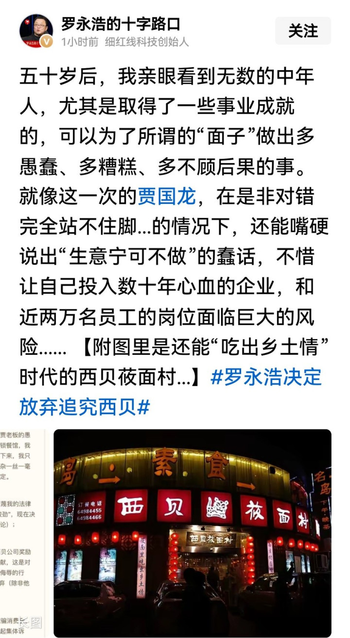 西贝的致歉信发了后,晚上罗永浩也发了文章,看的出来老罗是真的心软了,他不想看到别人的事业真的毁于一旦。尽管贾总没有向他道歉,也算了。