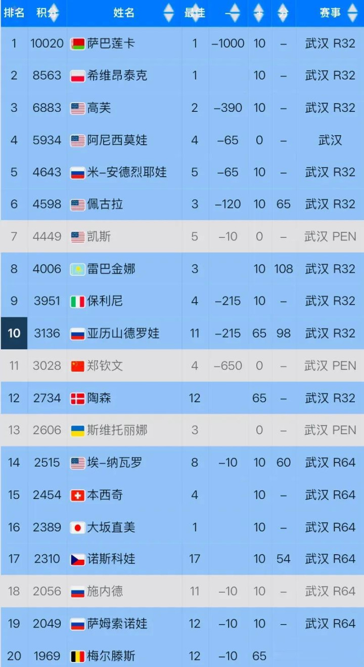 输掉这场比赛,王欣瑜被扣掉了去年武网女单四强的390分,总积分1056分,排名瞬间从第37位掉到了第62位,好在与第50名差距不到100分,接下来的亚洲赛季打好的话应该很快能回到Top50,擦干眼泪继续准备下一站比赛吧!